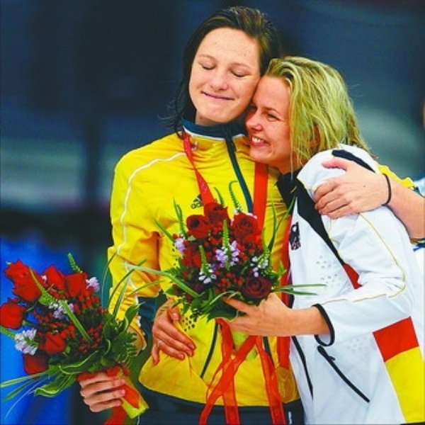 | 8月17日,德国选手布丽塔·斯特芬(右)夺得女子50米自由泳金牌,获得铜牌的澳大利亚选手凯特·坎贝尔向她表示祝贺。 新华社记者 丁 旭摄 |