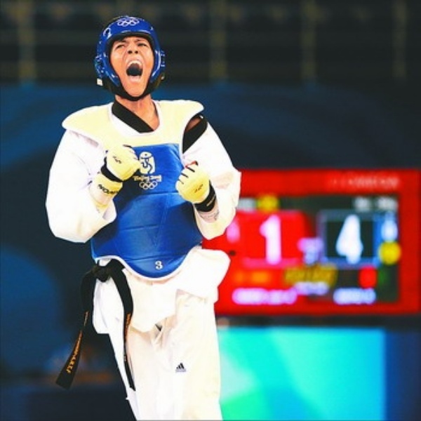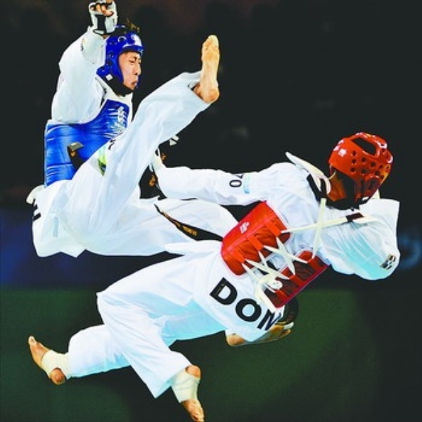 | 8月20日,中华台北选手朱木炎(左)在北京奥运会跆拳道男子58公斤级四分之一决赛中。