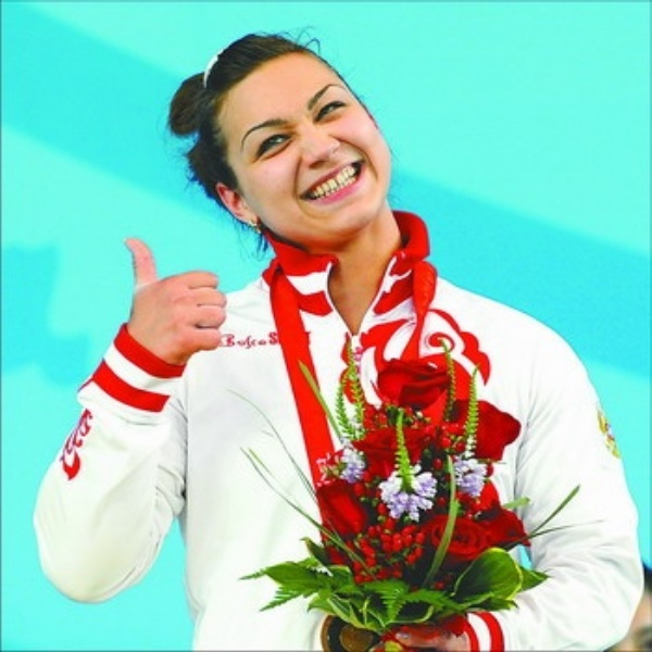 | 8月15日,获得北京奥运会举重女子75公斤级决赛铜牌的俄罗斯选手娜杰日达·叶夫斯秋欣娜在领奖台上。
