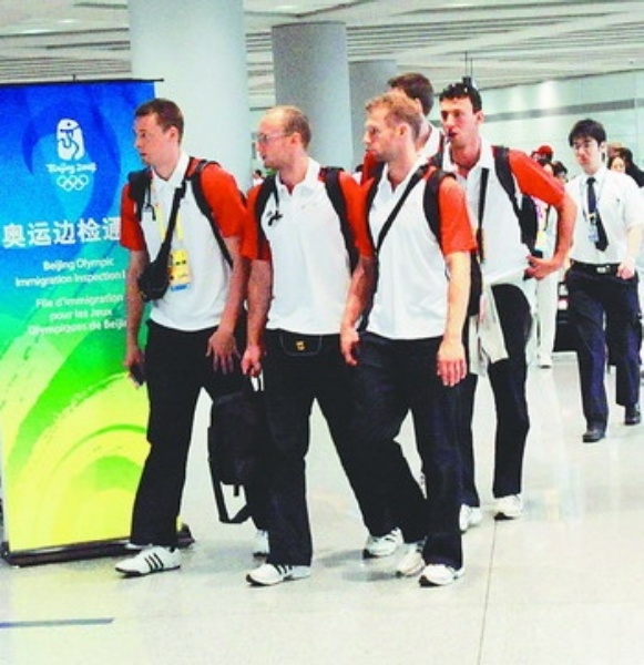 8月25日,一些奥运大家庭成员排队前往边检柜台准备办理出境手续。当日,记者从北京出入境边防检查总站获悉,北京口岸迎来首个奥运大家庭成员出境高峰,仅25日零时至9时,就有2150位持卡奥运大家庭成员从北京口岸出境。自2008年7月8日零时奥运身份注册卡生效起,截至8月24日零时,北京边检总站共办理持奥运身份注册卡入境的奥运大家庭成员39547人次,出境16324人次,涉奥专