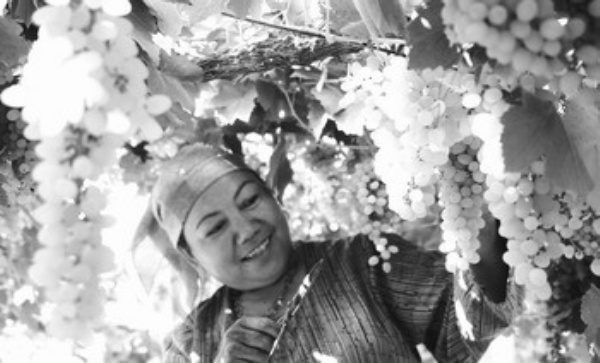 8月16日,吐鲁番市亚尔乡恰章村一名妇女在葡萄园里采摘成熟的葡萄。