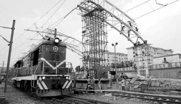 8月27日,在太原火车站,一列机车从正在施工的站台旁驶过。太原火车站改造工程目前正在紧张进行,这也是太原火车站建站以来最大规模的升级改造。