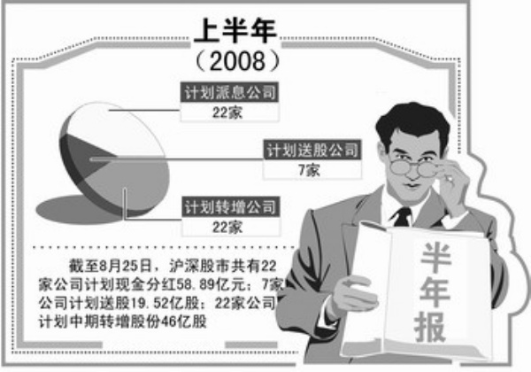 资料显示,截至8月25日,沪深股市共有1169家上市公司披露了半年报,其中37家公司公布了中期分配预案。从分红情况来看,22家公司计划现金分红58.89亿元,7家公司计划送股19.52亿股,因此今年中期上市公司分红总规模约为78.41亿元。市场人士表示,考虑到尚有400余家公司,特别是一批大蓝筹公司尚未披露半年报,因此今年中期分红规模有望超过2007年中期合计分红规模87.82亿元的高峰(16家公司现金分红80.03亿元,8家公司送股7.79亿股)。
