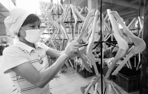 8月24日,广西荔浦的一位工人在上挂衣架喷漆。已成为全国木衣架生产大县的广西荔浦县,拥有各类衣架制品及其配套产品生产企业100多家,2007年衣架产量8亿多只,品种1000多个,完成工业总产值10亿多元。所生产的衣架制品90%以上出口外销世界各地,年出口量占全国同类产品出口总量的一半以上。2008年4月,广西荔浦被中国日用杂品工业协会授予“中国衣架生产基地”称号。