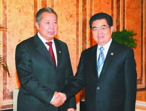 胡锦涛表示,去年我访问吉尔吉斯斯坦期间同巴基耶夫总统就全面深化中吉各领域互利合作达成的共识正在有序落实,两国关系又取得新进展。中方高度重视发展对吉关系,视吉尔吉斯斯坦为中国在中亚地区的重要伙伴。近年来,中吉各领域务实合作迅速扩大,经贸合作快速发展,希望双方共同落实好公路、铁路交通基础设施建设和口岸合作项目,深化中吉经贸合作。中方愿以本次上海合作组织成员国开展的北京奥运会安保合作为契机,同吉方加大安全合作力度,共同为维护本地区和平稳定作出努力。