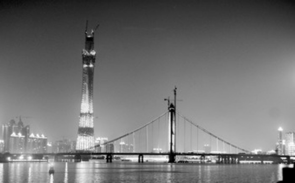 建于广州市新城市中轴线与珠江景观轴交汇处、北临珠江的广州新电视塔,是广州市的地标工程,主塔体高度454米,天线桅杆高度156米,总高度达到610米,建成后将成为“世界第一高塔”。 新华社记者 卢汉欣摄