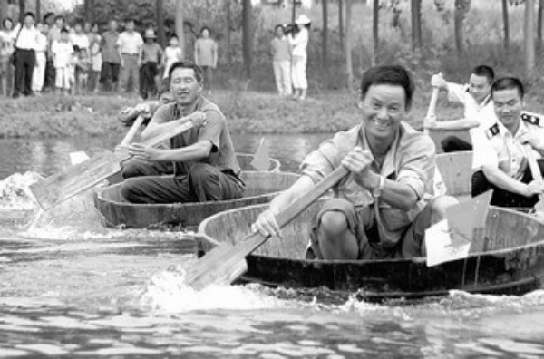 当日,浙江德清举行“赛农事 庆奥运”划菱桶比赛,当地机关工作人员、农民及船员共50多人参赛。划着菱桶采摘菱角是江南水乡群众的一项水上绝活。 倪立芳摄 (新华社发)