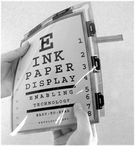 在电子纸的研制领域,成立于1997年的美国E—Ink公司具有优势地位,这家隶属于麻省理工学院的公司的电子超薄显示器技术代表目前业内的最高水准。E—Ink公司所研发的电子纸张,表面看起来与普通纸张十分相似,可以像报纸一样被折叠卷起,但实际上却有天壤之别。它上面涂有一种由无数微小的透明颗粒组成的电子墨水,颗粒直径只有人的头发丝的一半。这种微小颗粒内包含着黑色的染料和一些更为微小的白色粒子,染料使包裹着它的透明颗粒呈黑色,那些更为微小的白色粒子能够感应电荷而朝不同的方向运动,当它们集中向某一个方向运动时,就能使原本看起来呈黑色的颗粒的某一面变成白色。