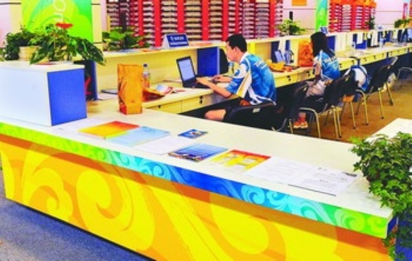 9月3日,为照顾残疾人记者,媒体工作间的服务台降低了工作台面的高度。北京残奥会主新闻中心媒体工作间除了各种无障碍标志外,还增添了包括残疾人记者工作台、盲人电脑、残疾人专用储物柜等根据残疾媒体工作者的特殊需求而准备的各种设施和服务项目。据了解,已有来自13个国家和地区的47名乘坐轮椅的残疾记者以及部分视力残疾记者报名采访北京残奥会。