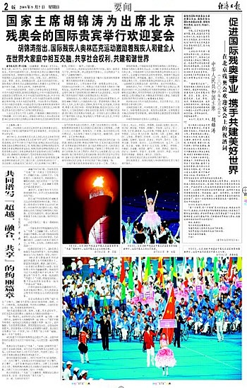 22时36分,激动人心的时刻到了。万众瞩目中,国家主席胡锦涛用洪亮的声音宣布:“北京2008年残奥会开幕!”