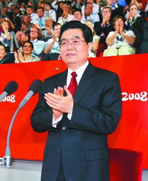 19时54分,在欢快的迎宾曲中,胡锦涛、江泽民和克雷文等来到主席台,向全场观众挥手致意。国家体育场内响起热烈的掌声。