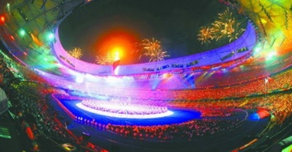 灯光转暗,音乐响起。一只象征着光明与温暖的太阳鸟从“鸟巢”上空翩翩飞来,大型文艺表演拉开帷幕。