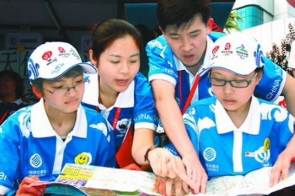 9月6日,来自灾区的段志秀(左一)和廖瑶瑶(右一)在城市志愿者服务站熟悉《北京市公交地图》。 当日,在北京西城区复兴商业城残奥会城市志愿者服务站点,汶川大地震的幸存者———北川中学的段志秀和王飞、绵竹东汽中学的李丹、什邡蓥华中学的廖瑶瑶,加入到残奥会城市志愿者队伍中。他们将和站点的志愿者一起为游客提供信息咨询、语言翻译等服务。