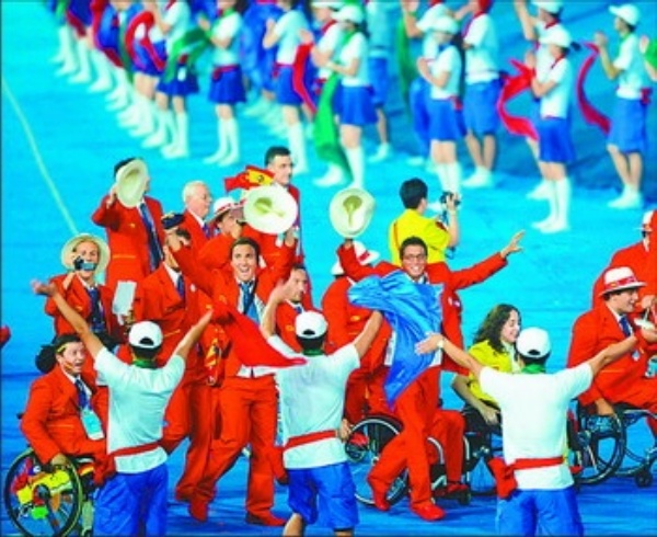 9月6日,北京2008年残奥会开幕式上,运动员们在欢快的乐曲声中入场。 本报记者 赵 晶摄