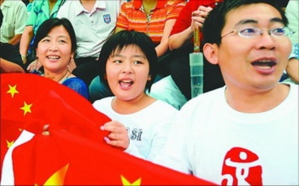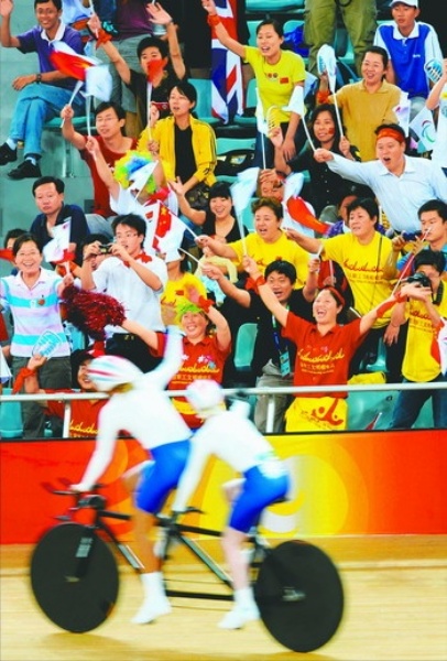 | 左图 9月7日,在北京老山自行车馆举行的北京2008年残奥会场地自行车比赛中,现场观众始终为参赛的运动员们加油助威,广大观众的热情令运动员倍受鼓舞。 本报记者 赵 晶摄 |