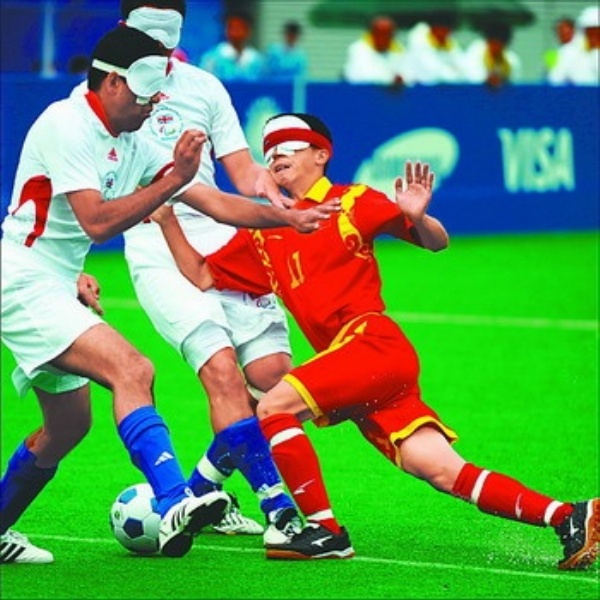 | 9月7日,在北京2008年残奥会五人制(盲人)足球小组赛中,中国队以3比0战胜英国队。 新华社记者 郭 勇摄 |