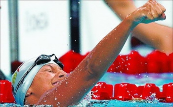 | 9月7日,西班牙选手玛丽亚·特雷莎·佩拉莱斯庆祝夺冠。当日,玛丽亚·特雷莎·佩拉莱斯在国家游泳中心进行的北京2008年残奥会S5级女子100米自由泳决赛中,以1分16秒65的成绩打破世界纪录并获得冠军。 新华社记者 丁 旭摄 |