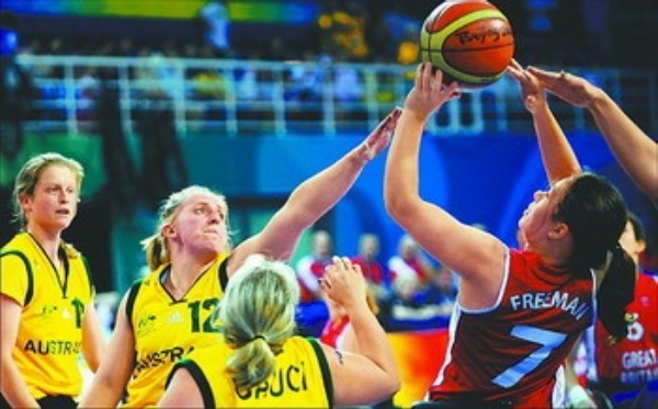 | 9月7日,在北京科技大学体育馆举行的北京2008年残奥会女子轮椅篮球A组预赛中,澳大利亚队与英国队酣战。 新华社记者 王晔彪摄 |