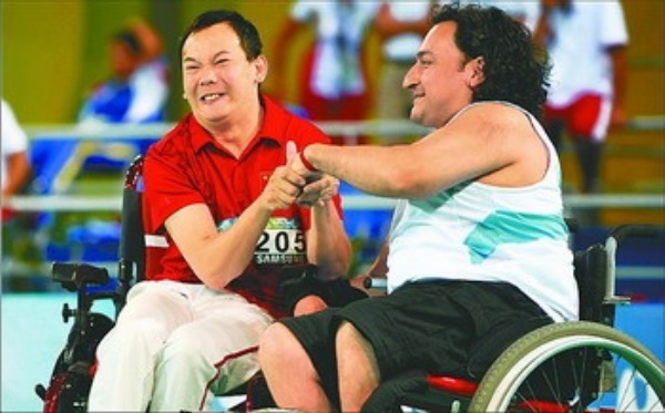 | 9月7日,中国选手曹绯(左)在混合单打BC2级比赛中向阿根廷选手科尔特斯表示祝贺。当日,北京2008年残奥会硬地滚球比赛在国家会议中心击剑馆开赛。 新华社记者 朱 峥摄 |