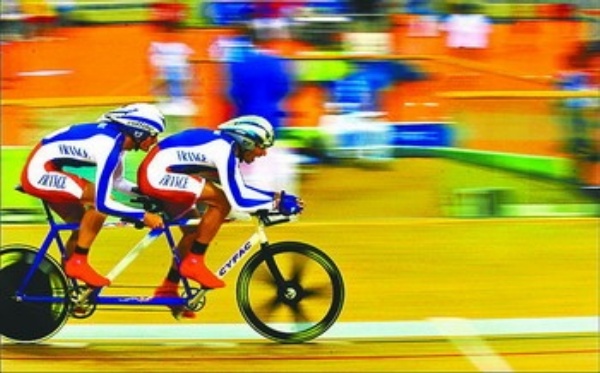 | 9月7日,法国选手奥利维耶·东瓦尔/约翰·萨科曼迪在北京2008年残奥会场地自行车男子个人追逐赛(B&VI 1—3)资格赛比赛中。当日,北京2008年残奥会场地自行车比赛在北京老山自行车馆开赛。 新华社记者 王 雷摄 |