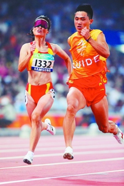 下图 9月8日,中国选手吴春苗(左)在领跑员引导下进行比赛。北京残奥会女子100米T11级比赛中,吴春苗晋级决赛。