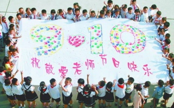 9月9日,安徽省含山县环峰小学的孩子们展示集体创作的教师节“手印作品”。当日,安徽省含山县环峰小学举办教师节庆祝活动,学生们将五彩小手印摁在布上,组成“9·10”图案,将这幅集体创作的“手印作品”献给老师,感谢师恩。 程千俊摄(新华社发)