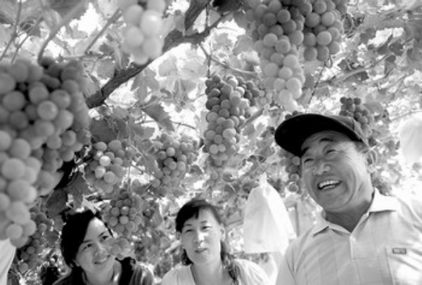 地处沙漠绿洲的敦煌市利用当地充足的阳光、沙土和灌溉方便等条件,大力发展葡萄产业。目前,全市的葡萄种植面积超过4.5万亩,全市农民每年从葡萄种植中得到的收入达到人均1032元。在阳关镇、七里镇、郭家堡镇等乡镇,形成了规模较大的葡萄产业带,这些沙漠中的“葡萄沟”成为旅游胜地敦煌的又一张名片。 敦煌市郭家堡镇农民年鹏生(右)在向游客介绍他家的葡萄