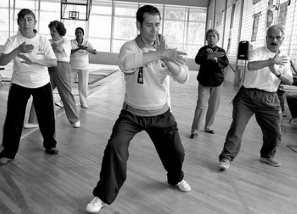 在墨西哥首都墨西哥城的体育中心,太极拳老师里卡多·桑切斯(中)带领学员进行太极拳训练。墨西哥武术学校利用周末时间组织中国文化与武术展示会,许多喜爱中国文化的墨西哥人应邀参加。 新华社记者 马国强摄