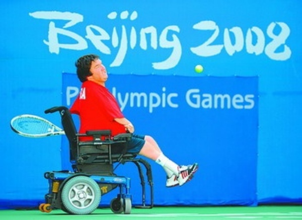9月10日,美国选手尼克·泰勒在比赛中用脚将球夹起发球。 29岁的尼克·泰勒自幼四肢残疾,手臂萎缩,只能将球拍绑在左臂上,发球时用两脚将球夹起。面对曾在雅典残奥会四肢残疾单打铜牌争夺战中击败过他的范埃尔普,泰勒不仅赢得抢七局晋级四强,还赢得了全场观众的掌声和尊敬。 新华社记者 韩传号摄