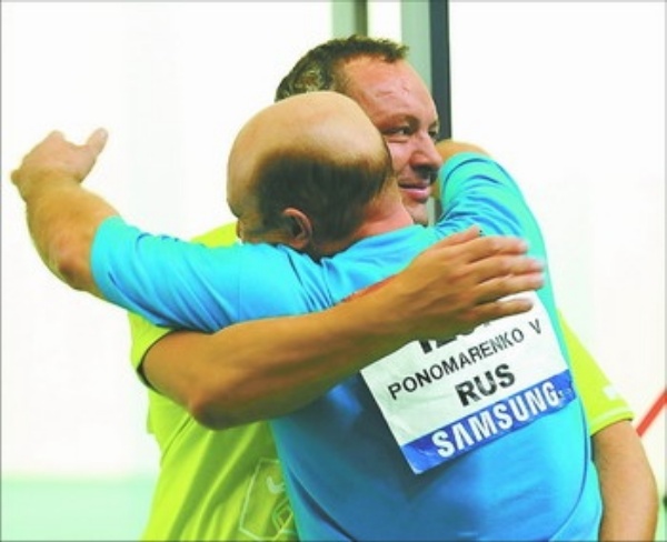 | 左图 9月10日,俄罗斯选手安德烈·列别金斯基(左)接受队友祝贺。当日,在北京残奥会射击P3混合组25米运动手枪—SH1决赛中,俄罗斯选手安德烈·列别金斯基以774.7环的总成绩获得冠军并打破此项目世界纪录。