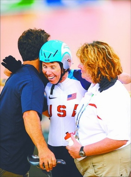 | 右图 9月10日,芭布·巴肯(中)赛后接受祝贺。当日,美国选手芭布·巴肯在北京2008年残奥会自行车女子个人追逐赛(LC3—4/CP 3)决赛中,以4分15秒848的成绩获得冠军。今年52岁的芭布·巴肯成为本届赛会自行车赛场年龄最大的冠军。