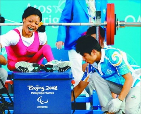 | 左图 9月10日,露西·奥格丘库埃吉克在成功打破世界纪录后露出笑容。当日,尼日利亚选手露西·奥格丘库埃吉克在北京2008年残奥会举重女子48公斤级比赛中,以130公斤的成绩打破世界纪录并夺冠。 新华社记者 杨 磊摄 |