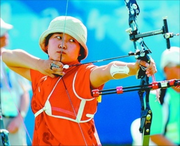 | 右图 9月10日,中国选手严会莲在北京2008年残奥会射箭女子个人反曲弓—站姿1/16淘汰赛中,以98环的总成绩战胜波兰选手阿莉恰·布坎斯卡,进入下一轮。 新华社记者 王小川摄 |