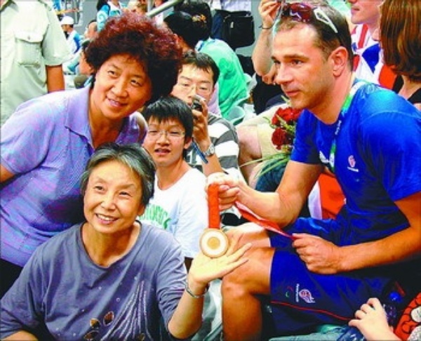 | 右图 9月9日,一名观众手托残奥会金牌与北京残奥会自行车男子1公里计时赛(CP3)冠军达伦·肯尼合影。当日,在北京老山自行车馆,英国选手达伦·肯尼获得残奥会自行车男子1公里计时赛(CP3)金牌。赛后达伦·肯尼坐到观众席上与家人一同观看比赛,吸引了许多中国观众前来与他合影。