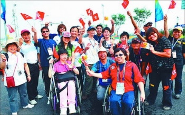 | 9月10日,观摩团成员合影留念。当日,北京2008年残奥会中国香港观摩团一行40余人在奥林匹克公园中心区游览,他们所到之处都洋溢着欢乐的气氛。观摩团成员将在一周的时间内在各场馆观赛为运动员助威,带队的团长表示这届残奥会给他们留下了许多美好的回忆。