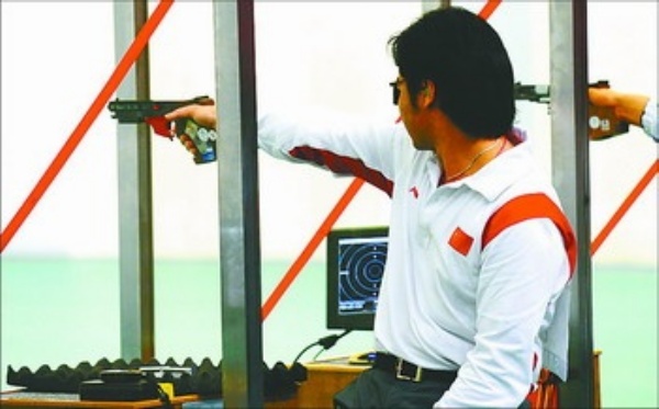 | 9月10日,中国选手李剑飞在比赛中。当日,在北京残奥会射击P3混合组25米运动手枪—SH1决赛中,中国选手李剑飞以774.3环的总成绩获得亚军。 新华社记者 任 勇摄 |