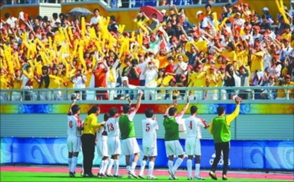 | 9月10日,在北京2008年残奥会七人制足球第一轮比赛结束后,参赛的运动员们向热情的观众致谢。 新华社记者 刘力航摄