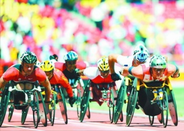 | 9月11日,北京2008年残奥会田径比赛在国家体育场进行,参加竞速轮椅比赛的运动员们你追我赶,顽强拼搏,赢得观众的阵阵掌声与喝彩。