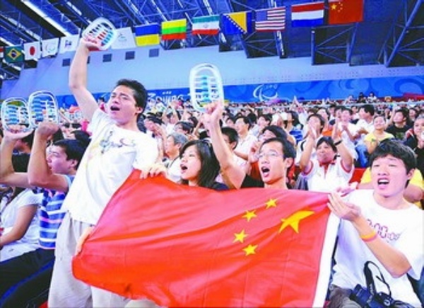 | 上图 9月11日,现场观众为中国队加油。当日,在北京残奥会男子坐式排球5—8名排位赛中,中国队以3比0战胜日本队。