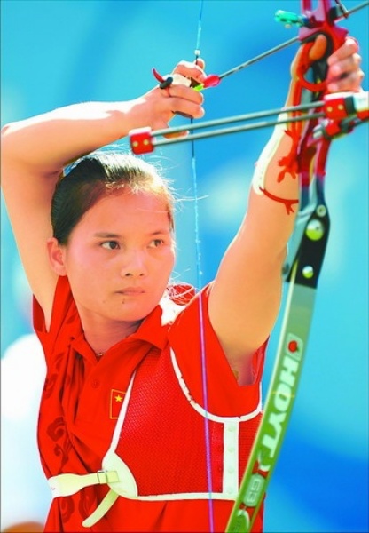 | 左图 9月11日,中国选手符洪芝在北京2008年残奥会女子个人反曲弓—坐姿1级/坐姿2级1/8淘汰赛中,以97环比75环战胜英国选手凯瑟琳·克里奇洛—史密斯,进入八强。中国另一名选手萧彦红也进入八强。