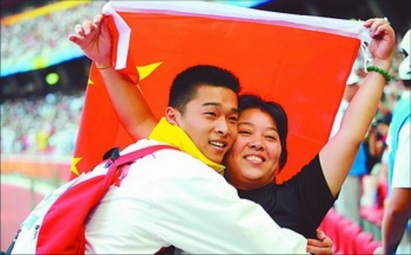 | 9月11日,中国选手郭伟与在现场观战的母亲拥抱在一起。当日,在国家体育场举行的北京2008年残奥会男子铁饼F35/36级决赛中,郭伟以54米13的成绩夺冠并打破世界纪录。