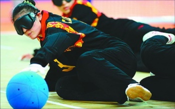 | 9月11日,中国队队员陈凤青(左)在比赛中救球。当日,在北京2008年残奥会女子盲人门球预赛中,中国队以3比1战胜日本队。