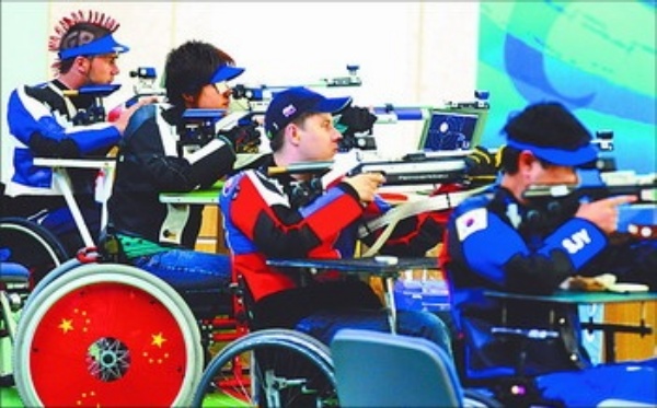 | 9月11日,中国选手张翠平(左二)在比赛中。当日,在北京2008年残奥会R3混合组10米气步枪卧射————SH1决赛中,张翠平以704.4环的总成绩获得亚军。 新华社记者 任 勇摄 |