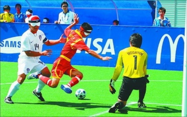 | 9月11日,中国队球员王亚锋(中)与韩国队球员金景浩(左)门前拼抢。当日,中国队在北京残奥会五人制足球小组赛中,以1比0战胜韩国队。