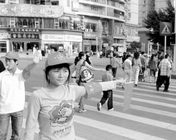9月11日,群众在文明劝导员志愿者的引导下通过斑马线。 日前,为增强市民的文明交通意识,来自重庆市渝北区各机关单位、学校、社区的上万名志愿者来到渝北的各个交通路口,充当起交通文明劝导员,通过对汽车驾驶员、过马路的市民进行文明劝导,使交通秩序得到改善,受到市民的好评。 新华社记者 刘 潺摄