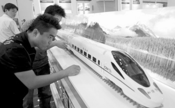 9月2日,中国北车长春轨道客车股份有限公司生产的“和谐号”动车组的模型引起不少年轻人的兴趣。