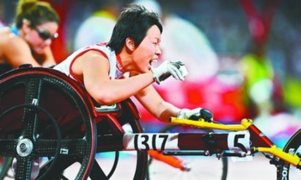 9月12日,中国选手黄丽莎在比赛后庆祝。当日,在国家体育场进行的北京2008年残奥会女子100米T53级决赛中,黄丽莎以16秒22的成绩夺冠并打破世界纪录。 新华社记者 郭大岳摄