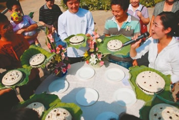 9月13日,几位市民在山东潍坊金宝乐园体验当地中秋传统民俗“念月”。 “念月”是山东潍坊的中秋传统民俗,每到中秋佳节,圆月初升,大人和孩子手捧用枣和面蒸的“月”,吟唱古老童谣,表达对好年景的憧憬。 王立军摄 (新华社发)
