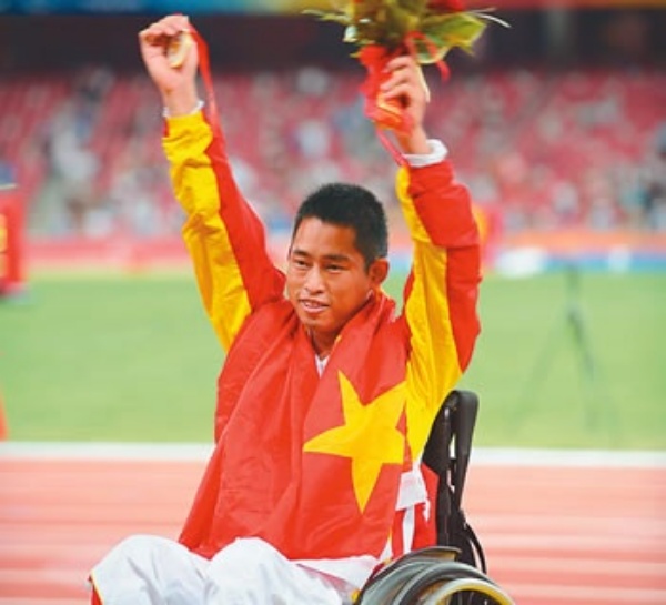 9月13日,北京残奥会男子200米T53级别的决赛中,中国选手余世然夺冠。 本报记者 赵 晶摄