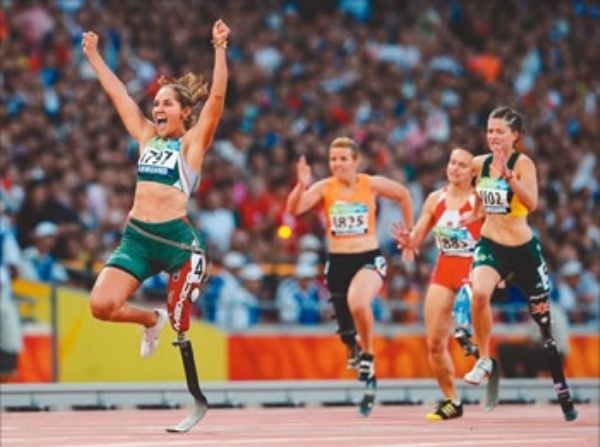 | 9月13日,墨西哥选手佩拉·布斯塔曼特(左一)冲过终点后庆祝。当日,在国家体育场进行的北京2008年残奥会女子100米T42级决赛中,布斯塔曼特以16秒32的成绩夺冠,并打破世界纪录。 新华社记者 郭大岳摄 |